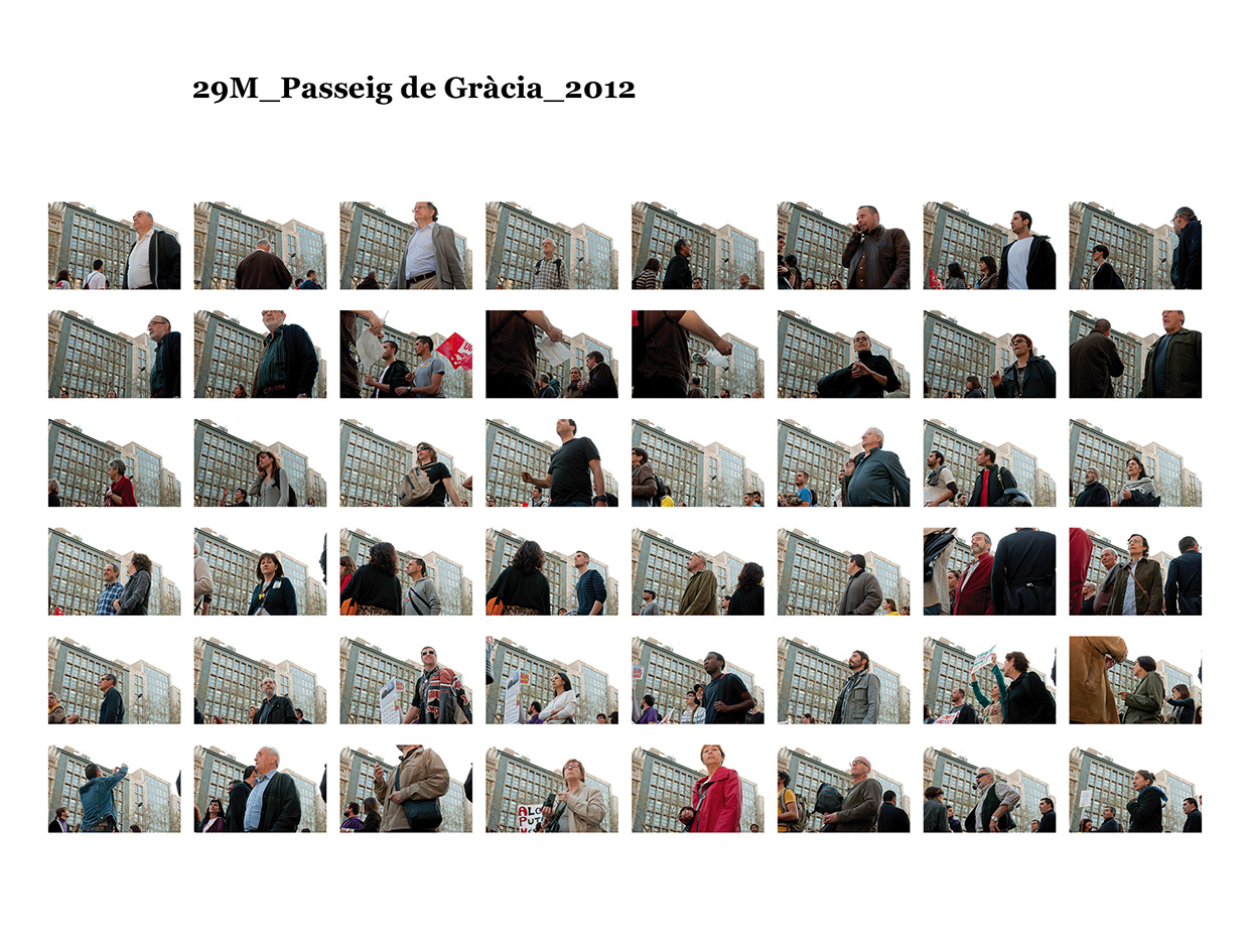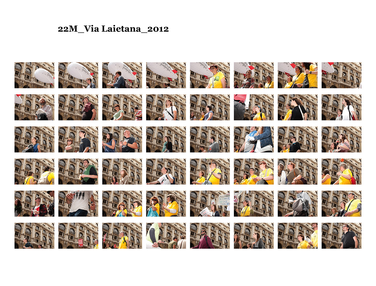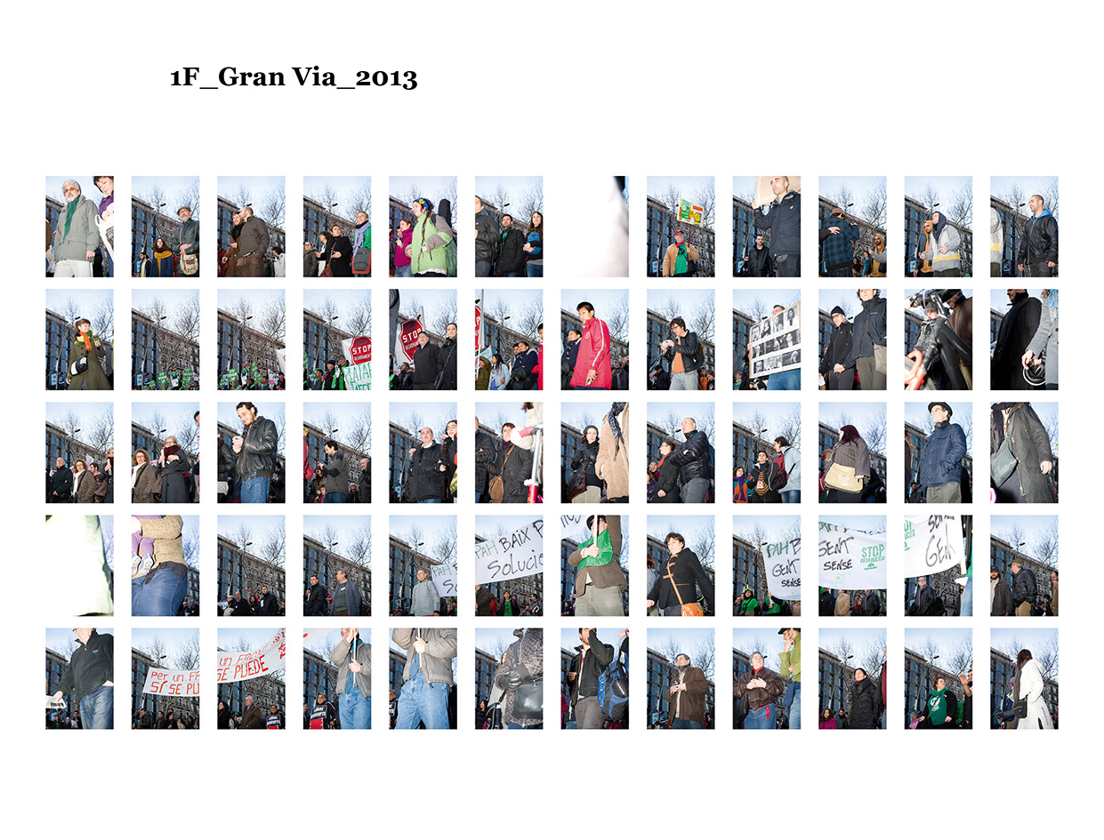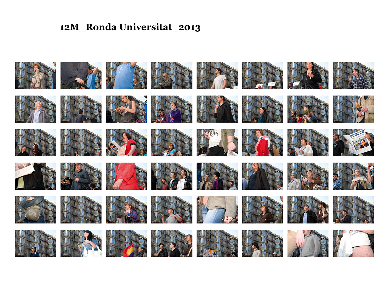 El 15 de maig de 2011 una sèrie de protestes ciutadanes pacífiques es van succeïr a diferents places públiques de les ciutats més importants del meu país per reivindicar un canvi en la política espanyola i en la seva societat. Se'ls va etiquetar com a "indignats", i era la primera vegada, desprès de l'esclat de l'actual crisi econòmica, que molts ciutadans sortien a manifestar-se al carrer. Amb exemples de protestes anteriors, com les de la Primavera Àrab o les d'Islàndia amb la Revolució de les Cassoles, i que en el seu moment van assolir uns resultats favorables pels ciutadans, a Espanya els manifestants tenien la intenció d’ocupar i instal·lar-se a les places públiques fins que se’ls escoltés. Amb el nom de WorldRevolution, altres protestes també es van formar espontàniament a ciutats com Lisboa, Dublín, Amsterdam, Brussel·les, París, Marsella, Berlín, Londres i, fins i tot, a Nova York amb OccupyWallStreet. Amb el 15M s’inicia una nova etapa, un nou estil de protestes ciutadanes al meu país que mostren clarament la necessitat que té una bona part de la població de reclamar un canvi social. Malgrat tot, la classe política espanyola gira l’esquena a aquestes manifestacions populars i continua la seva política basada en el retall de despesa pública, especialment en cultura educació i sanitat, desafavorint les classes més humils i gravant a pujades d’impostos els estrats de treballadors.Aquest treball va començar el 19 de juny de 2011, amb la manifestació que es va dur a terme un mes després de les fortes càrregues policials a la Plaça Catalunya, amb la intenció d'humanitzar, de posar cara, d’identificar la massa popular que es movia pels carrer de la meva ciutat. Des de llavors s'han anat donant una gran quantitat de manifestacions com aquella que he anat documentant d'una manera sistemàtica i amb la mateixa voluntat. La del 12 de febrer, la de la Vaga General, la del Dia del Treballador, la de les retallades en Educació el 22 de maig, la del 19 de juny, la de l'Assemblea Nacional Catalana l’11 de setembre i la de la Vaga General el 14 de novembre. I he seguit treballant aquest any amb la del 2 i la del 16 de febrer pel dret a l'Habitatge, la de 12 de març contra les restriccions europees, la del Dia del Treballador, la del 10 de maig i la de l’1 de juny.Potser aquesta és l'única eina que tenim o que sabem utilitzar per manifestar-nos però és que "no es pot no sortir al carrer". Ens trobem a les manifestacions i ens queixem cridant consignes, canalitzem una ràbia i una incertesa de si ens en sortirem i per uns moments caminem tots cap a una mateixa direcció. Potser és un "ritual" per creure en alguna cosa, un "jo també hi vaig ser" i continuem sortint al carrer, perquè no ho sabem fer de cap altra manera. I jo no sé si aquesta és la millor manera, però per com som i per d'on venim ara no podem no sortir al carrer perquè és l'única eina que tenim. I aquesta forma que tenim de manifestar-nos és la que vull documentar. I ho faig deixant de banda allò extraordinari dels fets que acostumem a veure als mitjans de comunicació o als massmedia, que tracten la manifestació com una massa amb vistes aèries i que busquen els moments dramàtics puntuals que s'hi puguin esdevenir, per centrar-me única i exclusivament en les persones que la formen, en allò no extraordinari però que en definitiva és el que hi passa.És un mosaic format per totes i cadascuna de les persones que han passat per davant del punt del recorregut on la fotògrafa es trobava. Cada fotografia remarca la importància de l'individu que, com jo mateixa puc arribar a fer, surt al carrer i camina per manifestar-se. Cada retrat aïlla l’individu de la resta, capturant el seu rostre, el seu moviment, les seves peculiaritats que formen part d’aquesta massa indefinida si l’observem des de lluny.Aquí una de les manifestacions i un petit vídeo de la manifestació del 16 de febrer de 2013 a Gran Via amb Villarroel.