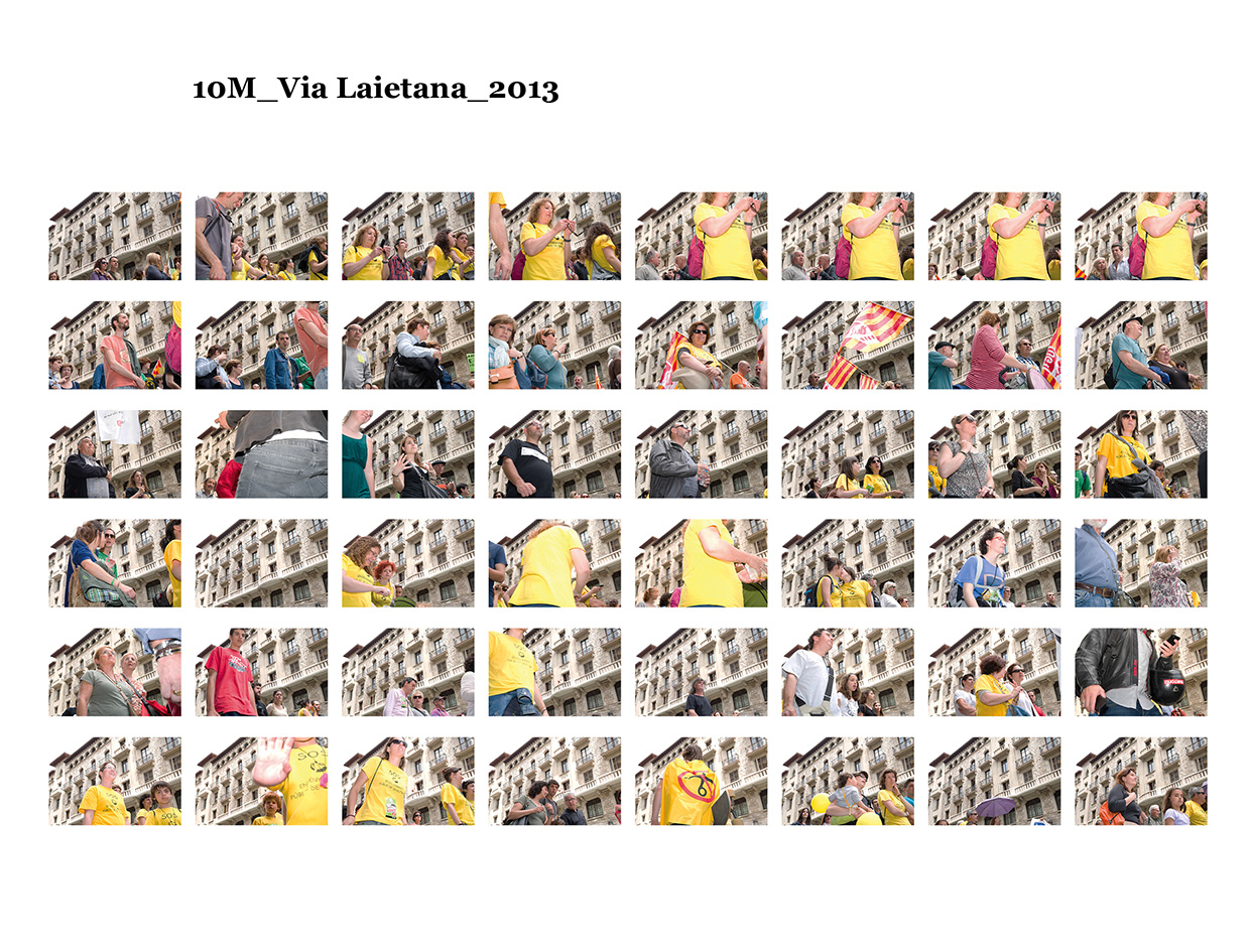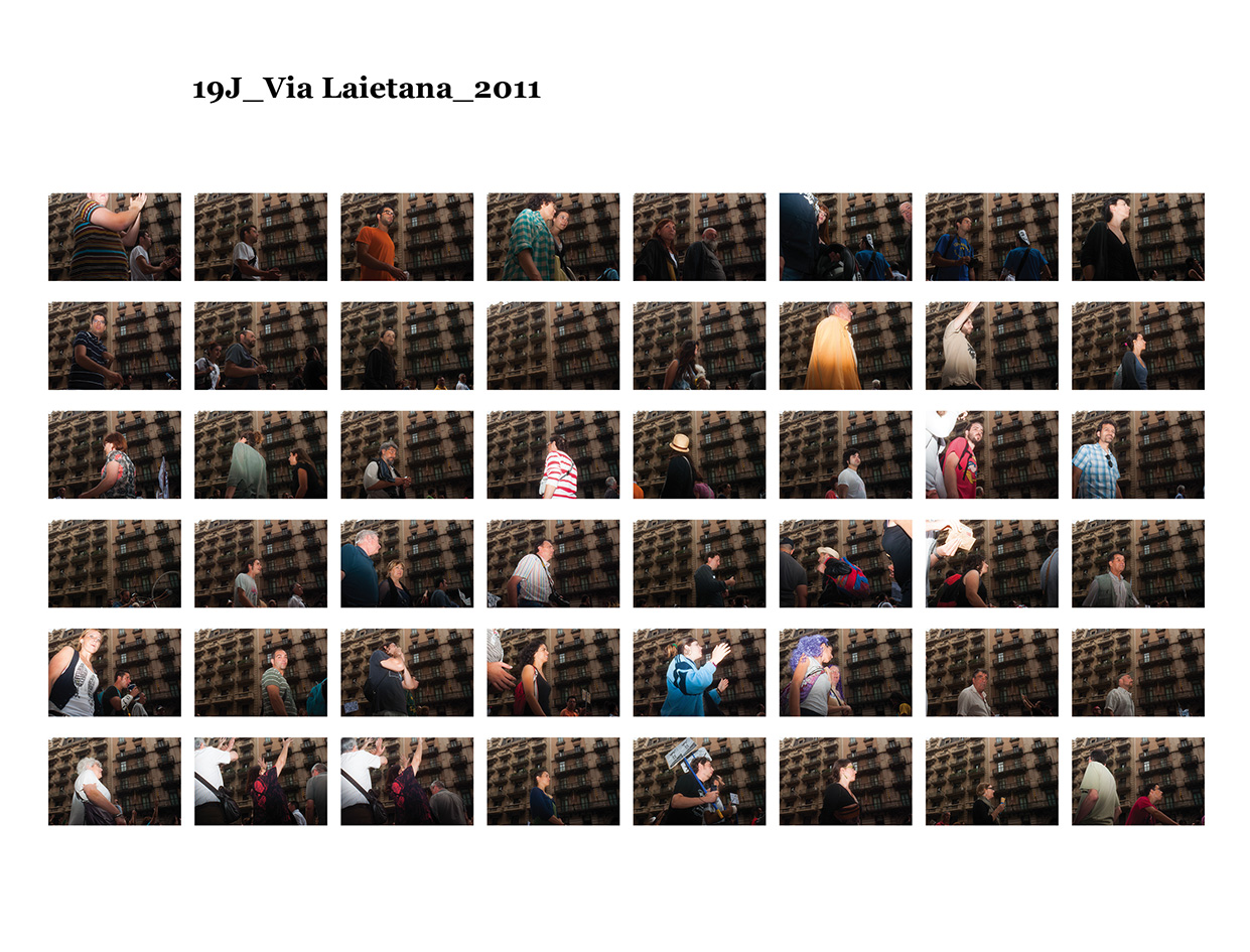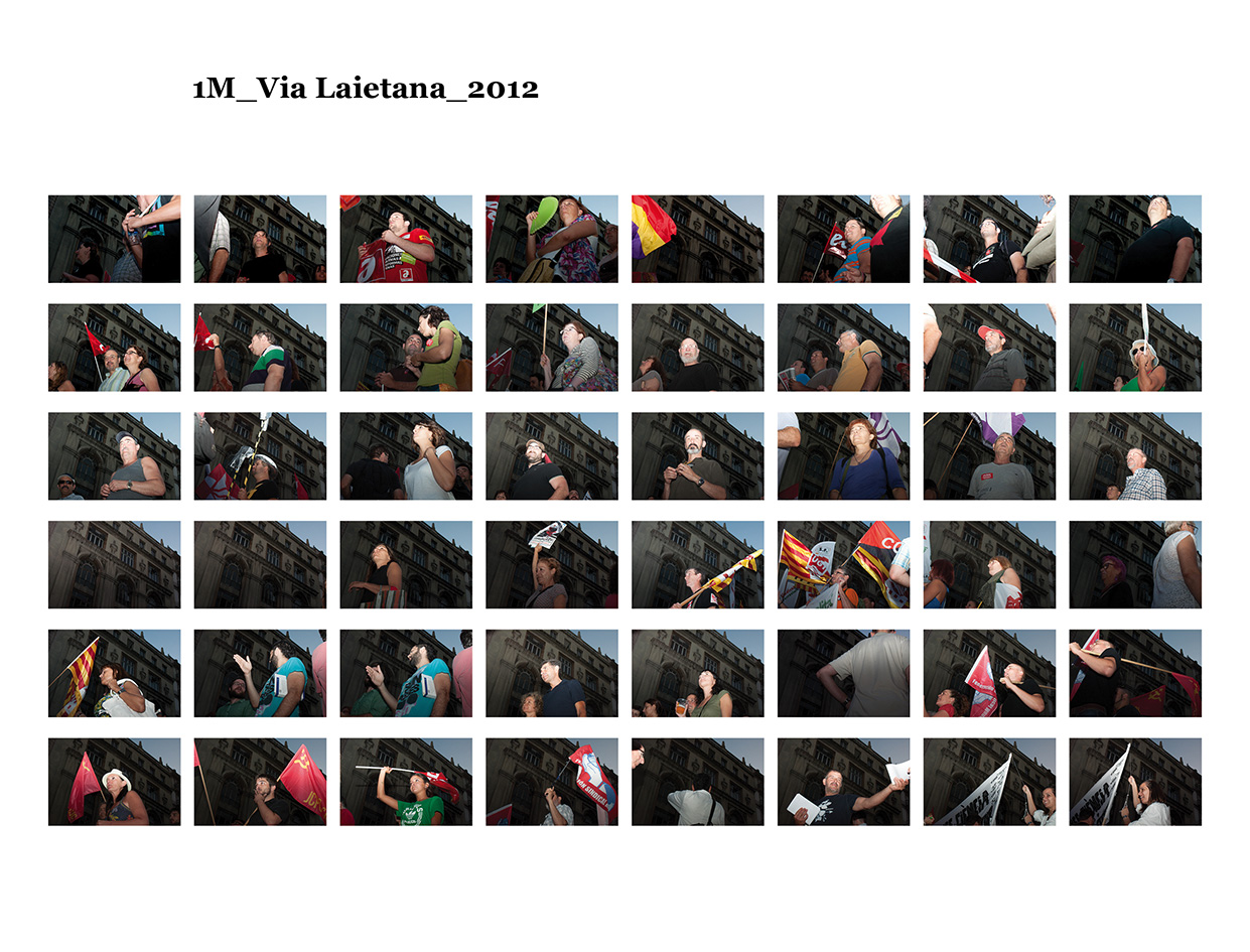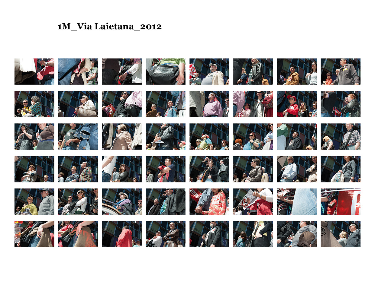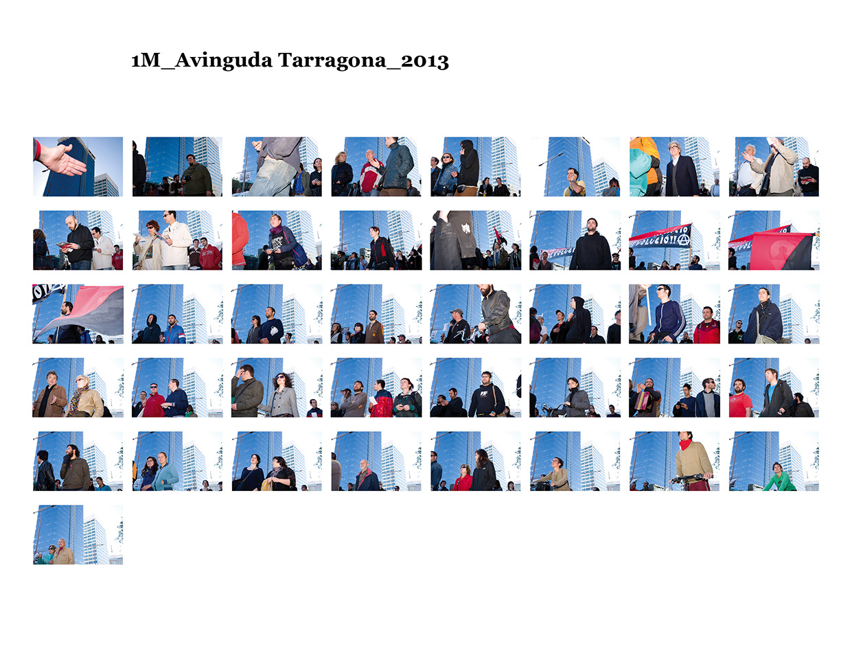 El 15 de maig de 2011 una sèrie de protestes ciutadanes pacífiques es van succeïr a diferents places públiques de les ciutats més importants del meu país per reivindicar un canvi en la política espanyola i en la seva societat. Se'ls va etiquetar com a "indignats", i era la primera vegada, desprès de l'esclat de l'actual crisi econòmica, que molts ciutadans sortien a manifestar-se al carrer. Amb exemples de protestes anteriors, com les de la Primavera Àrab o les d'Islàndia amb la Revolució de les Cassoles, i que en el seu moment van assolir uns resultats favorables pels ciutadans, a Espanya els manifestants tenien la intenció d’ocupar i instal·lar-se a les places públiques fins que se’ls escoltés. Amb el nom de WorldRevolution, altres protestes també es van formar espontàniament a ciutats com Lisboa, Dublín, Amsterdam, Brussel·les, París, Marsella, Berlín, Londres i, fins i tot, a Nova York amb OccupyWallStreet. Amb el 15M s’inicia una nova etapa, un nou estil de protestes ciutadanes al meu país que mostren clarament la necessitat que té una bona part de la població de reclamar un canvi social. Malgrat tot, la classe política espanyola gira l’esquena a aquestes manifestacions populars i continua la seva política basada en el retall de despesa pública, especialment en cultura educació i sanitat, desafavorint les classes més humils i gravant a pujades d’impostos els estrats de treballadors.Aquest treball va començar el 19 de juny de 2011, amb la manifestació que es va dur a terme un mes després de les fortes càrregues policials a la Plaça Catalunya, amb la intenció d'humanitzar, de posar cara, d’identificar la massa popular que es movia pels carrer de la meva ciutat. Des de llavors s'han anat donant una gran quantitat de manifestacions com aquella que he anat documentant d'una manera sistemàtica i amb la mateixa voluntat. La del 12 de febrer, la de la Vaga General, la del Dia del Treballador, la de les retallades en Educació el 22 de maig, la del 19 de juny, la de l'Assemblea Nacional Catalana l’11 de setembre i la de la Vaga General el 14 de novembre. I he seguit treballant aquest any amb la del 2 i la del 16 de febrer pel dret a l'Habitatge, la de 12 de març contra les restriccions europees, la del Dia del Treballador, la del 10 de maig i la de l’1 de juny.Potser aquesta és l'única eina que tenim o que sabem utilitzar per manifestar-nos però és que "no es pot no sortir al carrer". Ens trobem a les manifestacions i ens queixem cridant consignes, canalitzem una ràbia i una incertesa de si ens en sortirem i per uns moments caminem tots cap a una mateixa direcció. Potser és un "ritual" per creure en alguna cosa, un "jo també hi vaig ser" i continuem sortint al carrer, perquè no ho sabem fer de cap altra manera. I jo no sé si aquesta és la millor manera, però per com som i per d'on venim ara no podem no sortir al carrer perquè és l'única eina que tenim. I aquesta forma que tenim de manifestar-nos és la que vull documentar. I ho faig deixant de banda allò extraordinari dels fets que acostumem a veure als mitjans de comunicació o als massmedia, que tracten la manifestació com una massa amb vistes aèries i que busquen els moments dramàtics puntuals que s'hi puguin esdevenir, per centrar-me única i exclusivament en les persones que la formen, en allò no extraordinari però que en definitiva és el que hi passa.És un mosaic format per totes i cadascuna de les persones que han passat per davant del punt del recorregut on la fotògrafa es trobava. Cada fotografia remarca la importància de l'individu que, com jo mateixa puc arribar a fer, surt al carrer i camina per manifestar-se. Cada retrat aïlla l’individu de la resta, capturant el seu rostre, el seu moviment, les seves peculiaritats que formen part d’aquesta massa indefinida si l’observem des de lluny.Aquí una de les manifestacions i un petit vídeo de la manifestació del 16 de febrer de 2013 a Gran Via amb Villarroel.