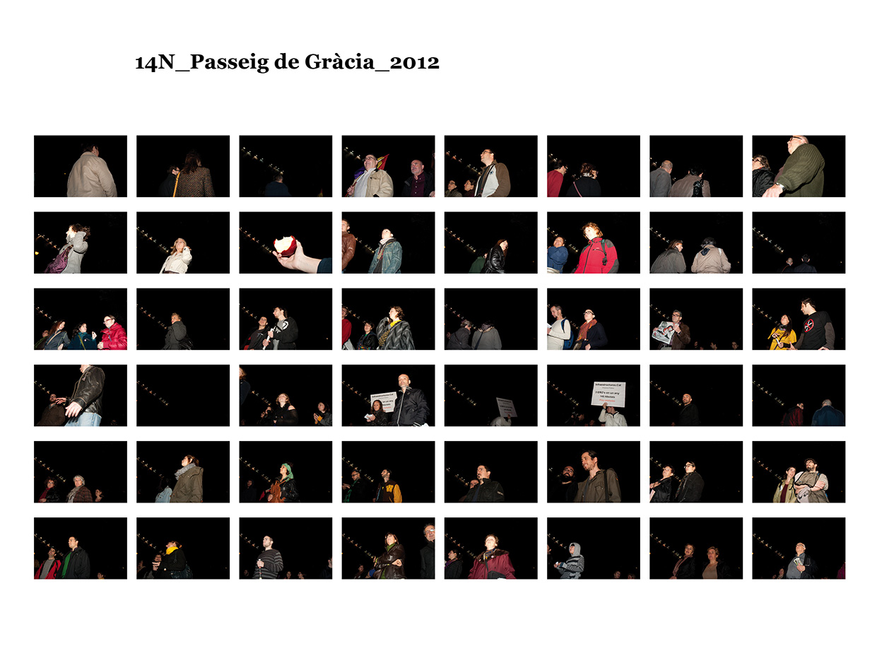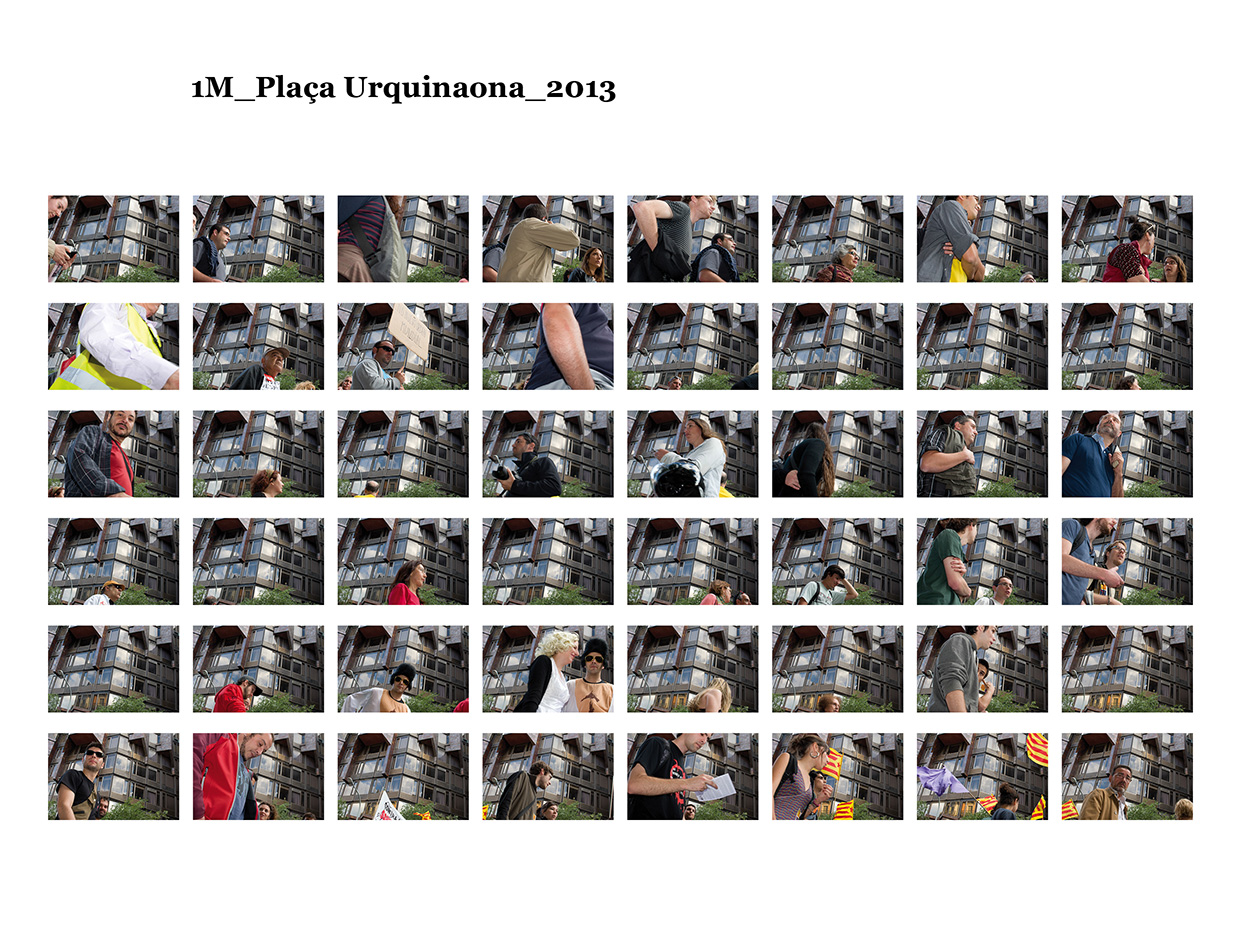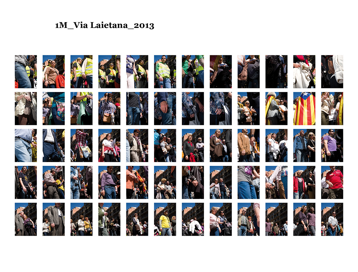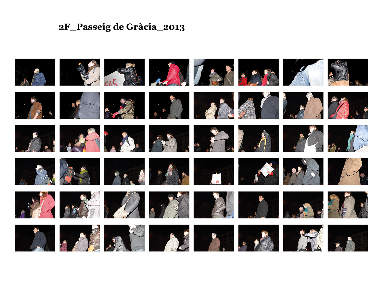 El 15 de maig de 2011 una sèrie de protestes ciutadanes pacífiques es van succeïr a diferents places públiques de les ciutats més importants del meu país per reivindicar un canvi en la política espanyola i en la seva societat. Se'ls va etiquetar com a "indignats", i era la primera vegada, desprès de l'esclat de l'actual crisi econòmica, que molts ciutadans sortien a manifestar-se al carrer. Amb exemples de protestes anteriors, com les de la Primavera Àrab o les d'Islàndia amb la Revolució de les Cassoles, i que en el seu moment van assolir uns resultats favorables pels ciutadans, a Espanya els manifestants tenien la intenció d’ocupar i instal·lar-se a les places públiques fins que se’ls escoltés. Amb el nom de WorldRevolution, altres protestes també es van formar espontàniament a ciutats com Lisboa, Dublín, Amsterdam, Brussel·les, París, Marsella, Berlín, Londres i, fins i tot, a Nova York amb OccupyWallStreet. Amb el 15M s’inicia una nova etapa, un nou estil de protestes ciutadanes al meu país que mostren clarament la necessitat que té una bona part de la població de reclamar un canvi social. Malgrat tot, la classe política espanyola gira l’esquena a aquestes manifestacions populars i continua la seva política basada en el retall de despesa pública, especialment en cultura educació i sanitat, desafavorint les classes més humils i gravant a pujades d’impostos els estrats de treballadors.Aquest treball va començar el 19 de juny de 2011, amb la manifestació que es va dur a terme un mes després de les fortes càrregues policials a la Plaça Catalunya, amb la intenció d'humanitzar, de posar cara, d’identificar la massa popular que es movia pels carrer de la meva ciutat. Des de llavors s'han anat donant una gran quantitat de manifestacions com aquella que he anat documentant d'una manera sistemàtica i amb la mateixa voluntat. La del 12 de febrer, la de la Vaga General, la del Dia del Treballador, la de les retallades en Educació el 22 de maig, la del 19 de juny, la de l'Assemblea Nacional Catalana l’11 de setembre i la de la Vaga General el 14 de novembre. I he seguit treballant aquest any amb la del 2 i la del 16 de febrer pel dret a l'Habitatge, la de 12 de març contra les restriccions europees, la del Dia del Treballador, la del 10 de maig i la de l’1 de juny.Potser aquesta és l'única eina que tenim o que sabem utilitzar per manifestar-nos però és que "no es pot no sortir al carrer". Ens trobem a les manifestacions i ens queixem cridant consignes, canalitzem una ràbia i una incertesa de si ens en sortirem i per uns moments caminem tots cap a una mateixa direcció. Potser és un "ritual" per creure en alguna cosa, un "jo també hi vaig ser" i continuem sortint al carrer, perquè no ho sabem fer de cap altra manera. I jo no sé si aquesta és la millor manera, però per com som i per d'on venim ara no podem no sortir al carrer perquè és l'única eina que tenim. I aquesta forma que tenim de manifestar-nos és la que vull documentar. I ho faig deixant de banda allò extraordinari dels fets que acostumem a veure als mitjans de comunicació o als massmedia, que tracten la manifestació com una massa amb vistes aèries i que busquen els moments dramàtics puntuals que s'hi puguin esdevenir, per centrar-me única i exclusivament en les persones que la formen, en allò no extraordinari però que en definitiva és el que hi passa.És un mosaic format per totes i cadascuna de les persones que han passat per davant del punt del recorregut on la fotògrafa es trobava. Cada fotografia remarca la importància de l'individu que, com jo mateixa puc arribar a fer, surt al carrer i camina per manifestar-se. Cada retrat aïlla l’individu de la resta, capturant el seu rostre, el seu moviment, les seves peculiaritats que formen part d’aquesta massa indefinida si l’observem des de lluny.Aquí una de les manifestacions i un petit vídeo de la manifestació del 16 de febrer de 2013 a Gran Via amb Villarroel.