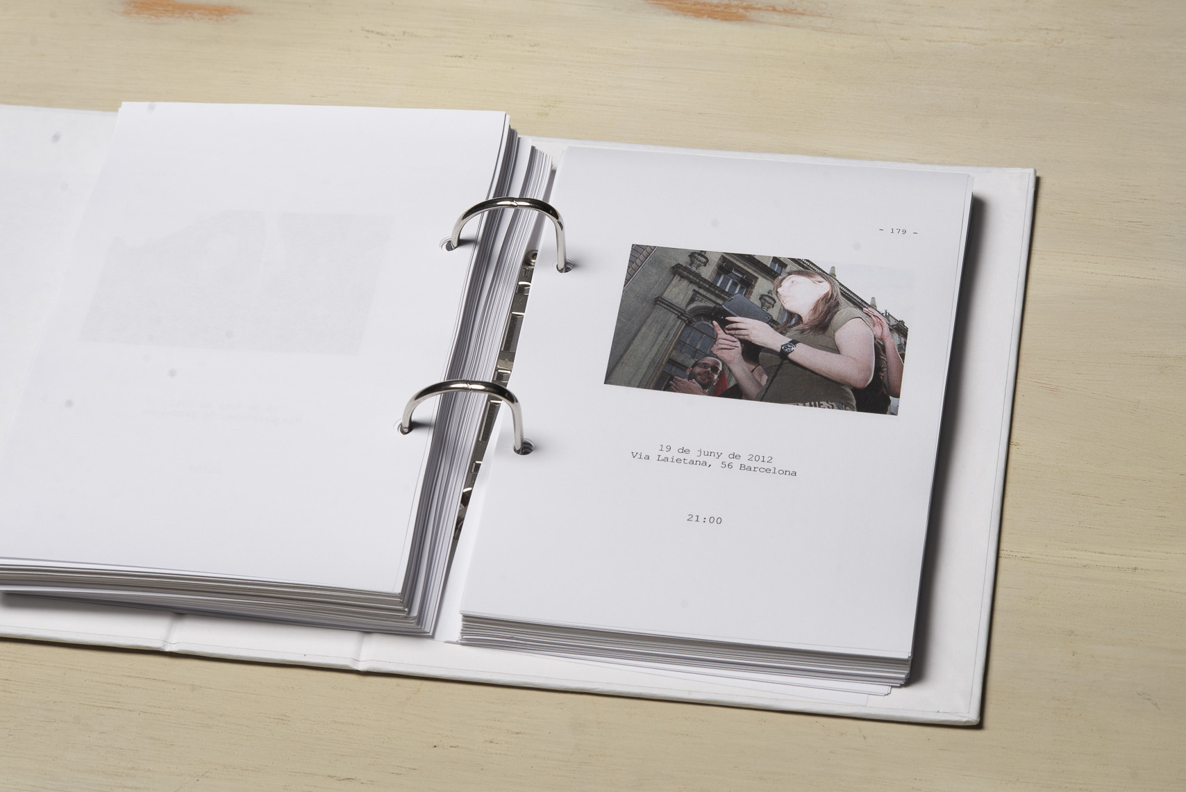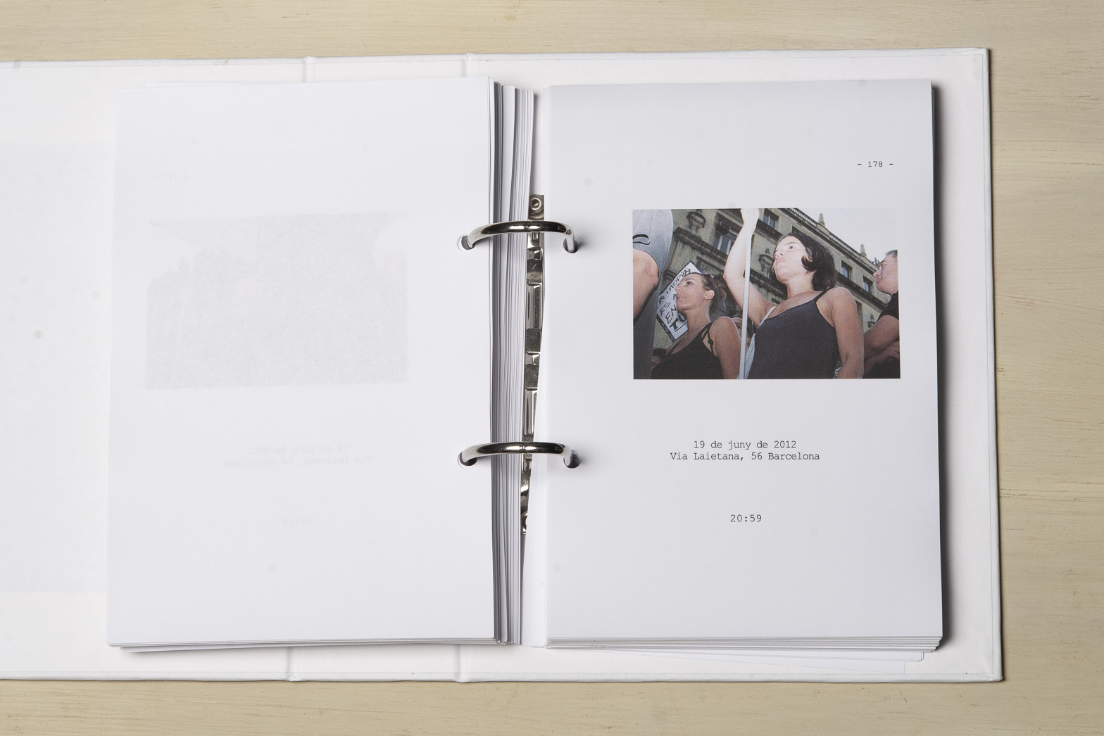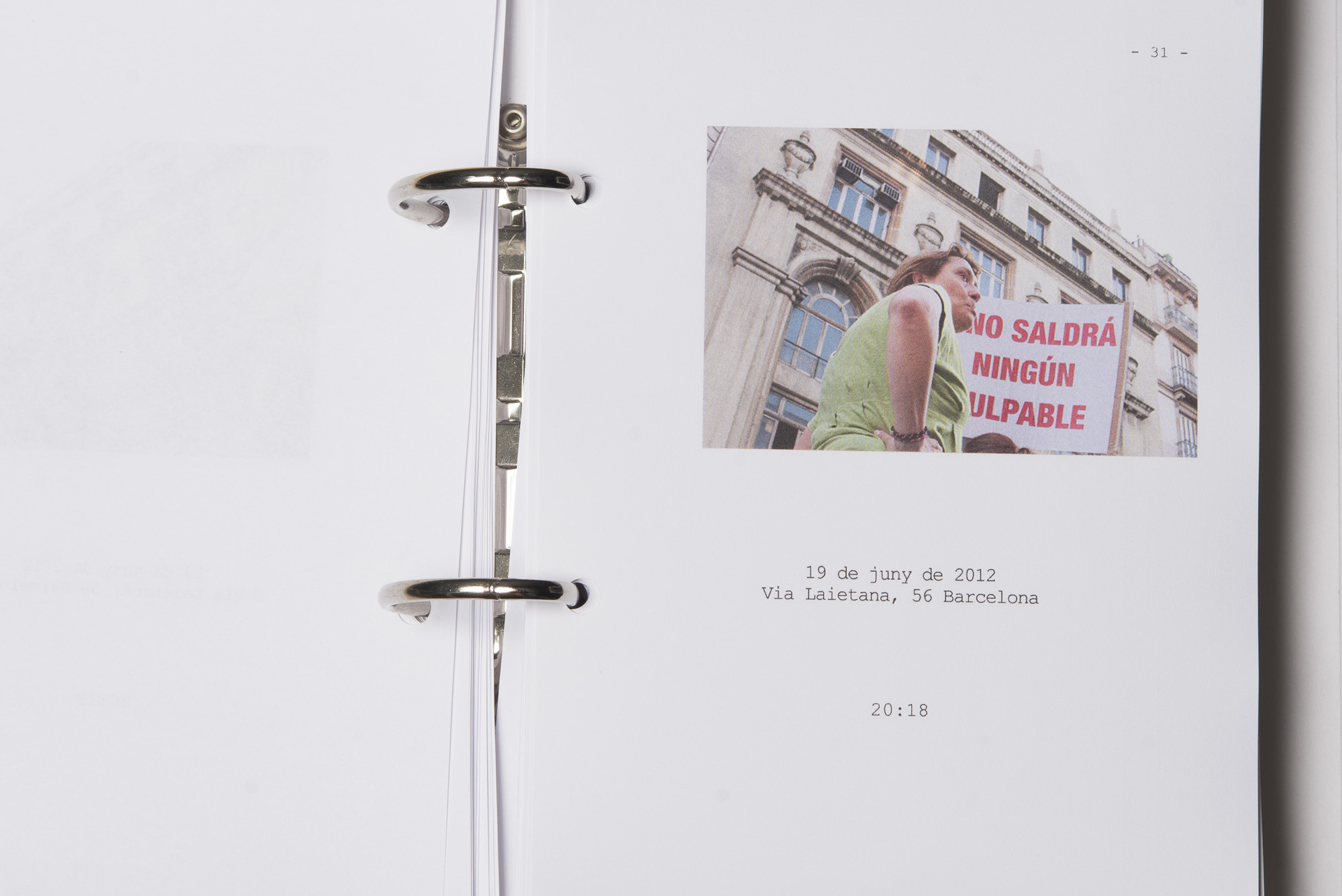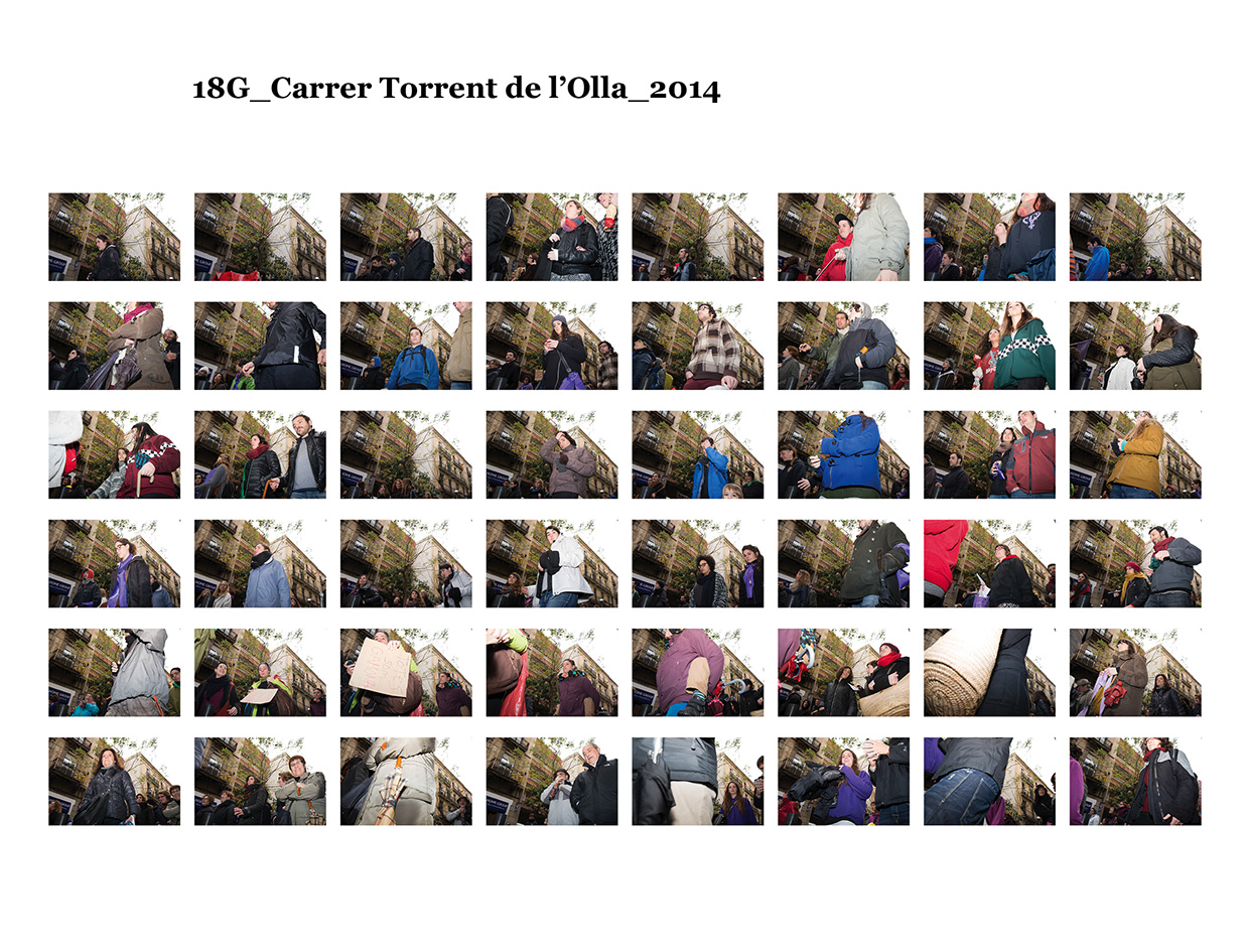 El 15 de maig de 2011 una sèrie de protestes ciutadanes pacífiques es van succeïr a diferents places públiques de les ciutats més importants del meu país per reivindicar un canvi en la política espanyola i en la seva societat. Se'ls va etiquetar com a "indignats", i era la primera vegada, desprès de l'esclat de l'actual crisi econòmica, que molts ciutadans sortien a manifestar-se al carrer. Amb exemples de protestes anteriors, com les de la Primavera Àrab o les d'Islàndia amb la Revolució de les Cassoles, i que en el seu moment van assolir uns resultats favorables pels ciutadans, a Espanya els manifestants tenien la intenció d’ocupar i instal·lar-se a les places públiques fins que se’ls escoltés. Amb el nom de WorldRevolution, altres protestes també es van formar espontàniament a ciutats com Lisboa, Dublín, Amsterdam, Brussel·les, París, Marsella, Berlín, Londres i, fins i tot, a Nova York amb OccupyWallStreet. Amb el 15M s’inicia una nova etapa, un nou estil de protestes ciutadanes al meu país que mostren clarament la necessitat que té una bona part de la població de reclamar un canvi social. Malgrat tot, la classe política espanyola gira l’esquena a aquestes manifestacions populars i continua la seva política basada en el retall de despesa pública, especialment en cultura educació i sanitat, desafavorint les classes més humils i gravant a pujades d’impostos els estrats de treballadors.Aquest treball va començar el 19 de juny de 2011, amb la manifestació que es va dur a terme un mes després de les fortes càrregues policials a la Plaça Catalunya, amb la intenció d'humanitzar, de posar cara, d’identificar la massa popular que es movia pels carrer de la meva ciutat. Des de llavors s'han anat donant una gran quantitat de manifestacions com aquella que he anat documentant d'una manera sistemàtica i amb la mateixa voluntat. La del 12 de febrer, la de la Vaga General, la del Dia del Treballador, la de les retallades en Educació el 22 de maig, la del 19 de juny, la de l'Assemblea Nacional Catalana l’11 de setembre i la de la Vaga General el 14 de novembre. I he seguit treballant aquest any amb la del 2 i la del 16 de febrer pel dret a l'Habitatge, la de 12 de març contra les restriccions europees, la del Dia del Treballador, la del 10 de maig i la de l’1 de juny.Potser aquesta és l'única eina que tenim o que sabem utilitzar per manifestar-nos però és que "no es pot no sortir al carrer". Ens trobem a les manifestacions i ens queixem cridant consignes, canalitzem una ràbia i una incertesa de si ens en sortirem i per uns moments caminem tots cap a una mateixa direcció. Potser és un "ritual" per creure en alguna cosa, un "jo també hi vaig ser" i continuem sortint al carrer, perquè no ho sabem fer de cap altra manera. I jo no sé si aquesta és la millor manera, però per com som i per d'on venim ara no podem no sortir al carrer perquè és l'única eina que tenim. I aquesta forma que tenim de manifestar-nos és la que vull documentar. I ho faig deixant de banda allò extraordinari dels fets que acostumem a veure als mitjans de comunicació o als massmedia, que tracten la manifestació com una massa amb vistes aèries i que busquen els moments dramàtics puntuals que s'hi puguin esdevenir, per centrar-me única i exclusivament en les persones que la formen, en allò no extraordinari però que en definitiva és el que hi passa.És un mosaic format per totes i cadascuna de les persones que han passat per davant del punt del recorregut on la fotògrafa es trobava. Cada fotografia remarca la importància de l'individu que, com jo mateixa puc arribar a fer, surt al carrer i camina per manifestar-se. Cada retrat aïlla l’individu de la resta, capturant el seu rostre, el seu moviment, les seves peculiaritats que formen part d’aquesta massa indefinida si l’observem des de lluny.Aquí una de les manifestacions i un petit vídeo de la manifestació del 16 de febrer de 2013 a Gran Via amb Villarroel.